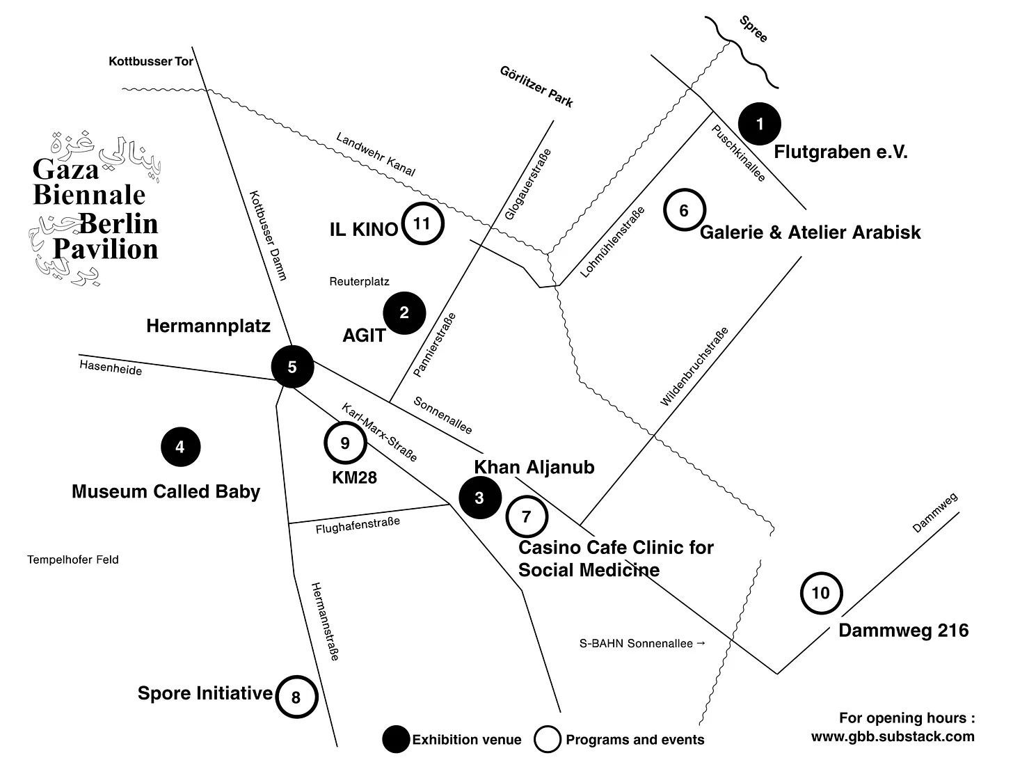 The Gaza Biennale Berlin Pavilion unfolds with exhibitions at venues including Flutgraben, AGIT, Khan Aljanub and Museum Called Baby, and programs hosted at Galerie & Atelier Arabisk, Casino Café Clinic for Social Medicine, Spore Initiative and KM28 among others, as well as around the streets of Berlin. With a collaboratively curated public program, the Gaza Biennale Berlin Pavilion invites people of all ages and backgrounds to join in talks, workshops, screenings and other gatherings to practice listening, healing and mourning; share joy and sorrow; and cultivate a communal strength that will ultimately be the key to dismantling oppressive systems based on fragmentation and extractivism—structural relics that lie at the root of the occupation of Palestine and colonial violence worldwide.